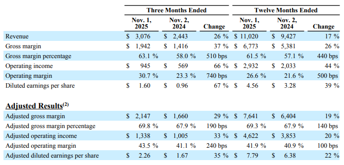 ADI公布了2025财年第四财季及全年财报。第四财季,ADI营收30.76亿美元,同比增长26%;毛利率63.1%,同比增长5.1个百分点;运营利润9.45亿美元,同比增长66%。2025财年,ADI营收110.2亿美元,同比增长17%;毛利率61.5%,同比增长4.4个百分点;运营利润29.32亿美元,同比增长44%。