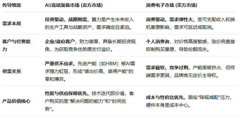 对于下游设备商,分化更为尖锐。AI服务器、高端装备制造商能相对顺畅地将芯片涨价成本向下传导,其核心焦虑在于保障供应。这背后是两类市场截然不同的底层逻辑: