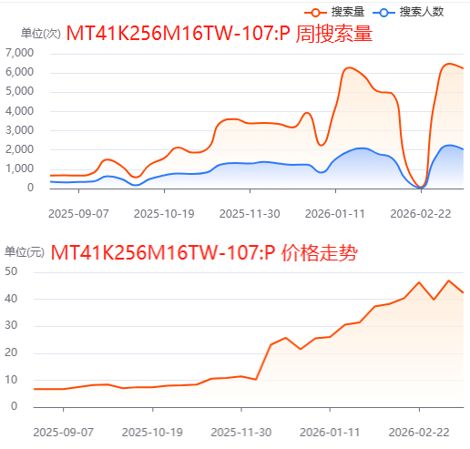 该型号是美光的DDR3L内存芯片,被广泛应用于工业控制、网络通信设备、消费电子、计算设备与服务器、汽车电子等众多领域。在存储器涨价的背景下,该型号的热度持续走高,节后搜索量也迅速回弹至节前高位水平。