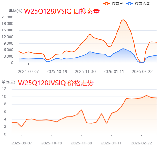 也可看到,W25Q128JVSIQ的价格主升段是在今年1月份,2月起维持在高位区间,迄今为止趋于稳定。与搜索量结合来看,其行情已来到短期平衡点,最紧张的阶段或已过去,未来行情变动仍需关注。