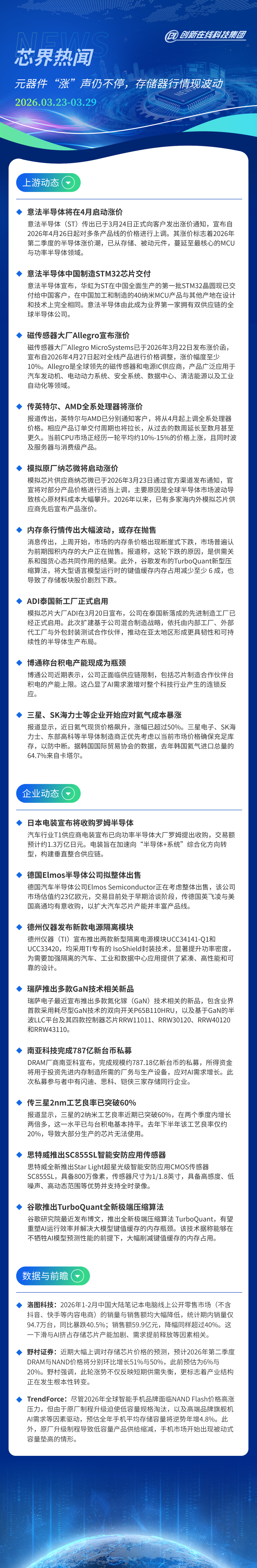 首页 > 【芯界热闻26.03.23-03.29】元器件“涨”声仍不停,存储器行情现波动